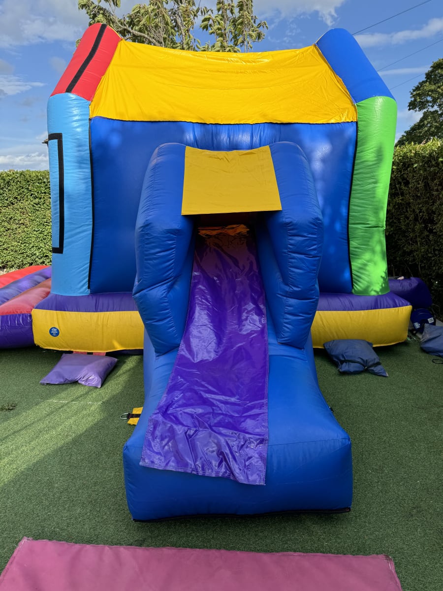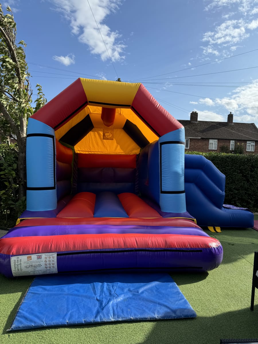 15ft x 18ft Multicoloured Bouncy Castle With A Slide for hire in ealing, hounslow, hayes, uxbridge, pinner, northwood and surrounding areas.