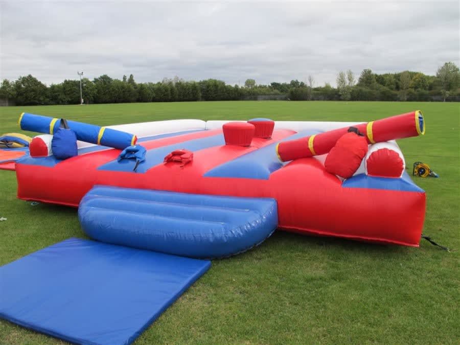 Comes with 2 headguards, 4 Pugil sticks, 2 podiums and bouncy base